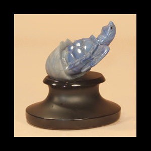 DESCRIPTION: This depicts a hatching turtle in its first moments of life. The turtle is carved out of Blue Quartz. The base is black calcite.
