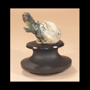 DESCRIPTION: This piece depicts a hatching turtle in its first moments of life. The turtle is carved out of serpentine stone and sits on a base of black calcite.