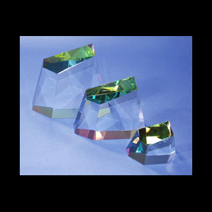 DESCRIPTION: These optical crystal freeforms have a di-chroic coating on the bottom. The different faces reflect a variety of colors from blues to reds to purples. Available in the following widths: 4", 6" and 8".