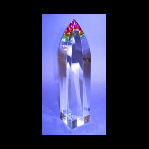 DESCRIPTION: We call this a "conical" obelisk because of the unusual soft shape at the top. Available in the following heights: 5", 8" and 11" and 14". The base is 2 1/4" square. Each has a di-chroic coating on the bottom which gives a wonderful multi-color reflection. All are made from the finest optical crystal available. Call us for more details.