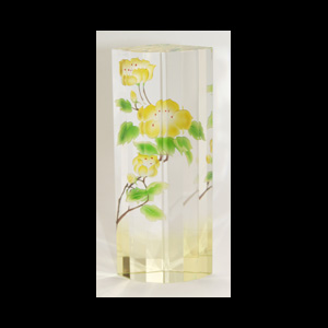 DESCRIPTION: This wonderful flowered piece is one of the latest additions to our line. The back is triangular and the front is fully faceted giving different looks as you turn it. The pattern is formed by first sandblasting the optical crystal and then hand painting the design. Available in one size. Makes a great combination with the two larger pieces in this series. Call us for more details.