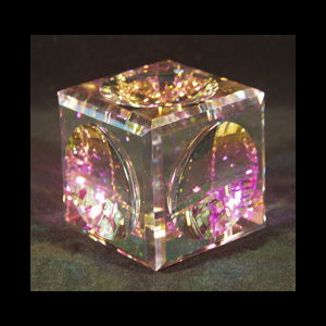 DESCRIPTION: These cubes have three concave sides which have been di-chroic coated. This gives off a multitude of colors which change as you turn the cube. Available in the following sizes: 2 3/8" (60mm), 3 1/8" (80mm) and 4" (100mm).