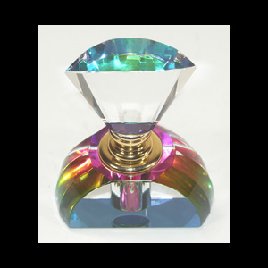 DESCRIPTION: These perfume bottles are made from the finest optical glass. Both the bottle and the stopper have a di-chroic coating creating a spectacular array of reflected color.