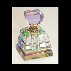 DESCRIPTION: These perfume bottles are made from the finest optical glass. The top is made from beautiful purple glass which is a perfect addition to the di-chroic coating on the bottom of the bottle. You will enjoy the reflected colors of yellows, blues, greens and purples.