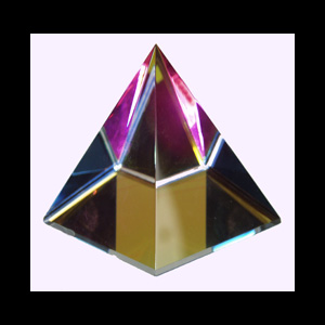 DESCRIPTION: This is the classic shape and angles of an Egyptian pyramid. The bottom of each piece is di-chroic coated giving a beautiful array of color. Available in the following sizes: 1 1/2" square, 2" square, 3" square and 4" square.