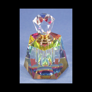 DESCRIPTION: These perfume bottles are made from the finest optical glass. Both the bottle and the stopper have a di-chroic coating creating a spectacular array of reflected color.