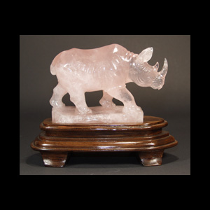 DESCRIPTION: You will never see a better quality of rose quartz or a finer carving of a Rhino. It is truly a one of a kind collector's piece. The wood base is included.