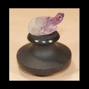 DESCRIPTION: This hatching turtle is depicted in its first moments of life. The turtle is carved out of Brazilian amethyst and sits on a base of black calcite.