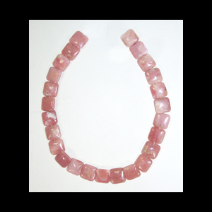 DESCRIPTION: Each string of these pink opal beads is 16" long and each bead measures 16mm square and about 4mm thick. The material comes from Peru.