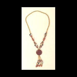 DESCRIPTION: Wonderful carnelian colored glass beads, with a carnelian agate disc, formed into a high styled 18" necklace. Great value. Call us for prices. Limited quantity.