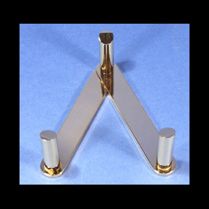 DESCRIPTION: 24K gold plated over brass. This display stand is great for those heavy minerals with rough bottoms. This heavy brass stand will hold almost any weight. Measures 6" x 4 1/2" with 2" pegs. It will open wider.