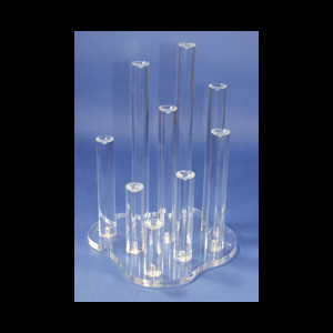 DESCRIPTION: This acrylic unit holds 9 50mm spheres from 4" to 12" high all on a freeform base. It comes apart and ships in a flat carton with instructions enclosed for setting up.